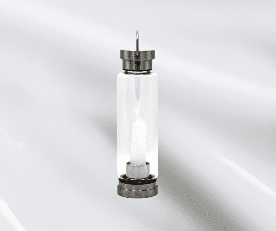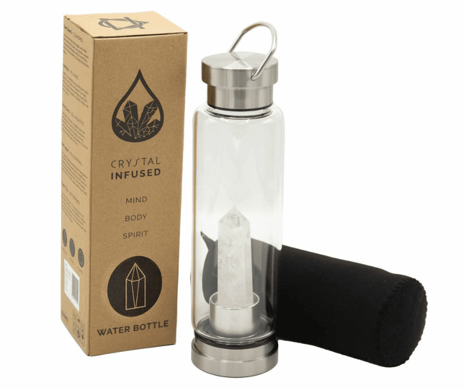 Szklana butelka na wodę z kryształem górskim jest idealna do przygotowywania kryształowych eliksirów czyli wody, w której zanurzono kryształ. Wg medycyny naturalnej kryształowe eliksiry mogą poprawiać nasz rozwój umysłowy, duchowy i emocjonalny. Butelka wykonana jest ze szkła oraz stali nierdzewnej i jest wielokrotnego użytku, jest poręczna, wygodna w użytkowaniu a do tego przepiękna. Stosowanie szklanych butelek na wodę przyczynia się do ochrony środowiska dzięki czemu eliminujemy zużycie butelek plastikowych i wspieramy inicjatywę zero waste.